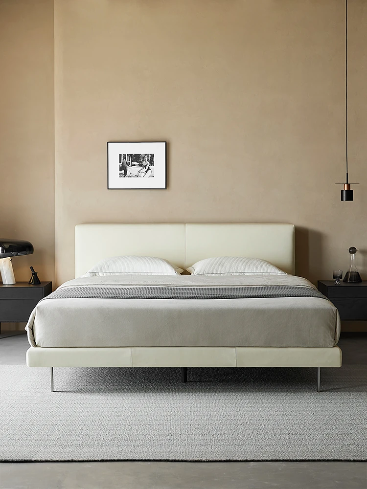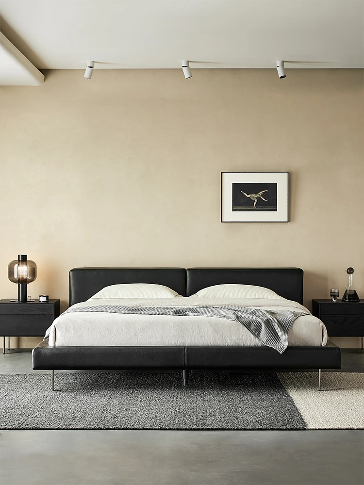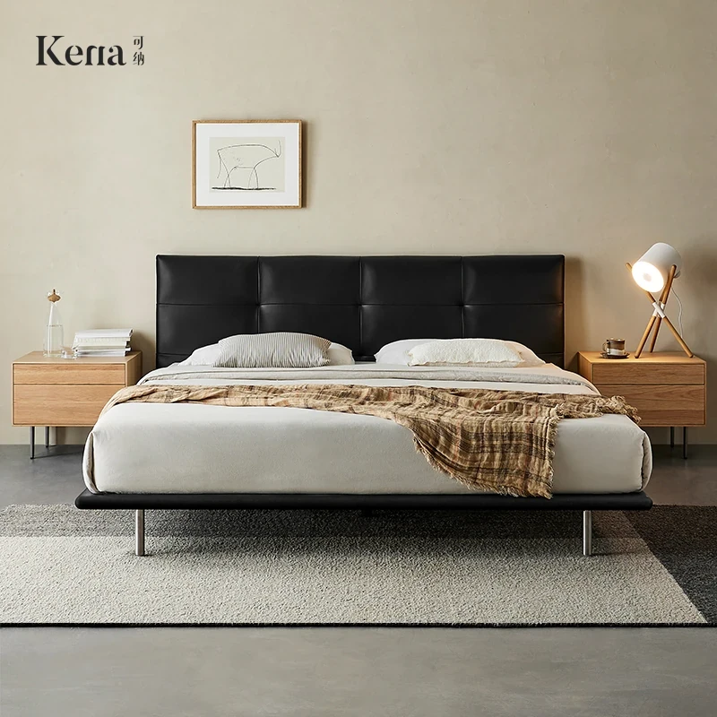 Kena Retro Genuine Leather 1.8m Floor Double Bed - Italian Minimalist Modern King Size Bed for Master Bedroom