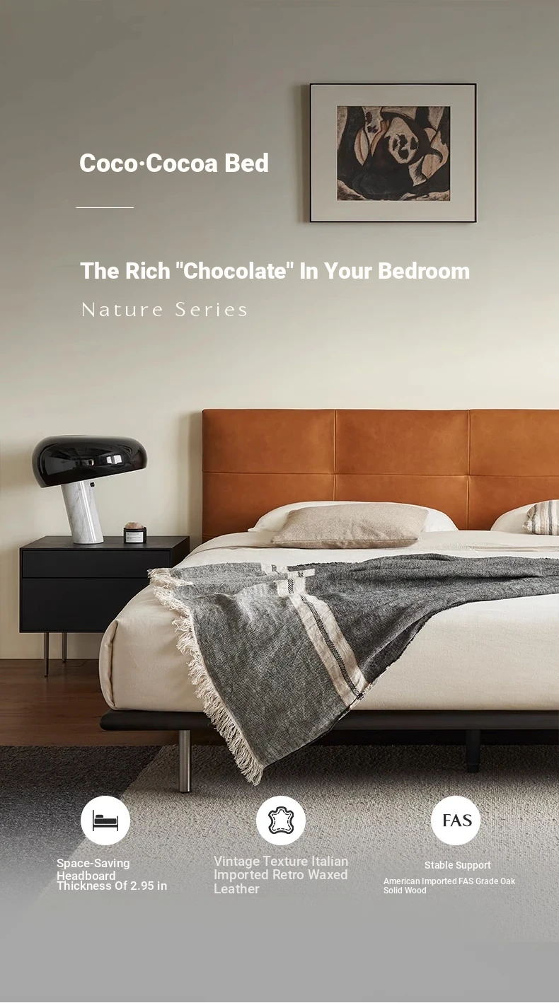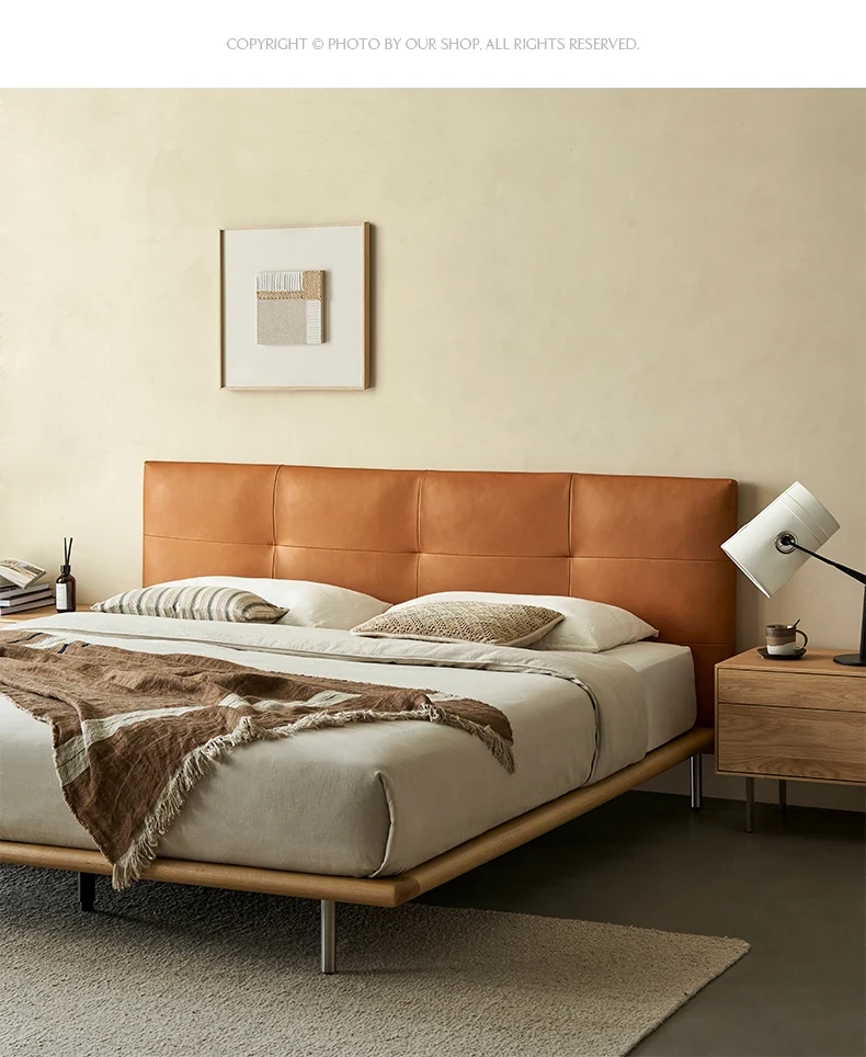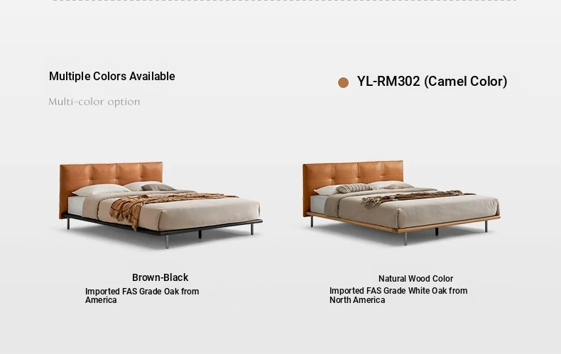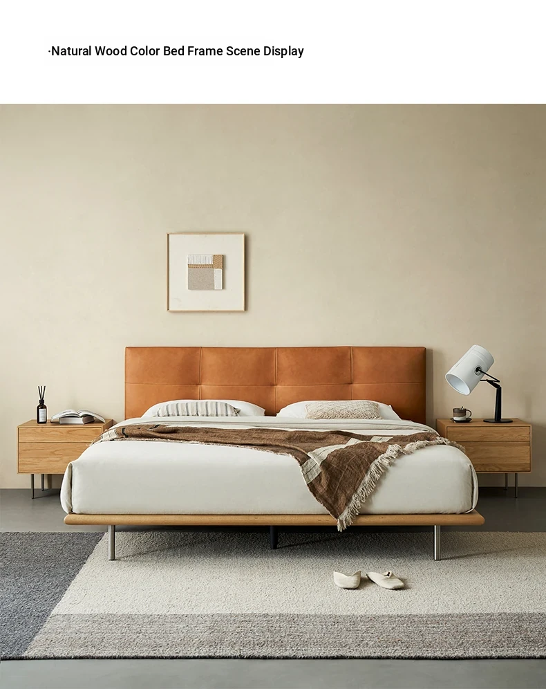 [North American White Oak-log color bed frame] Camel leather solid wood bed In Stock