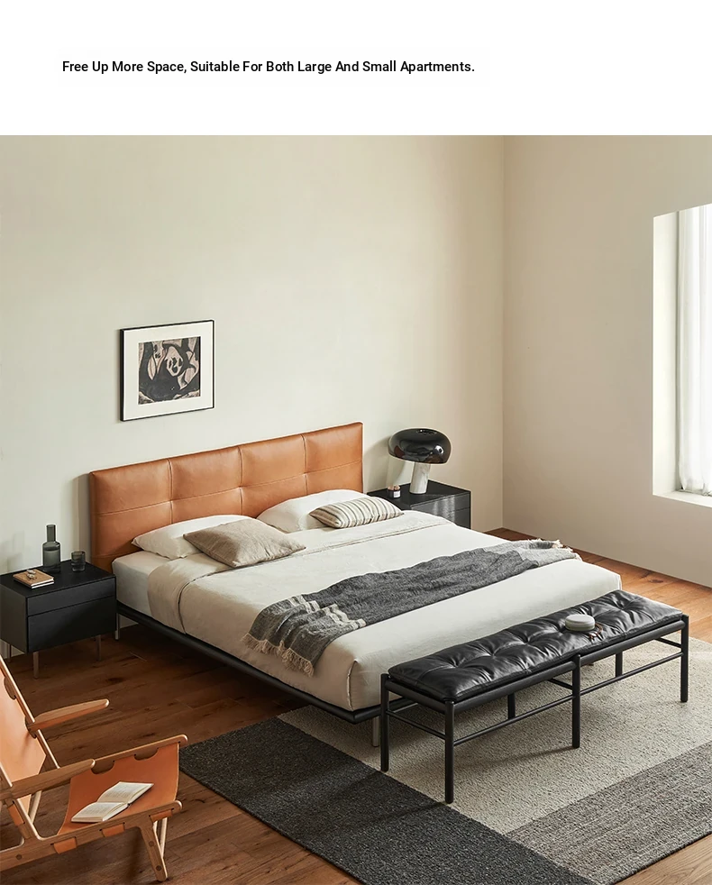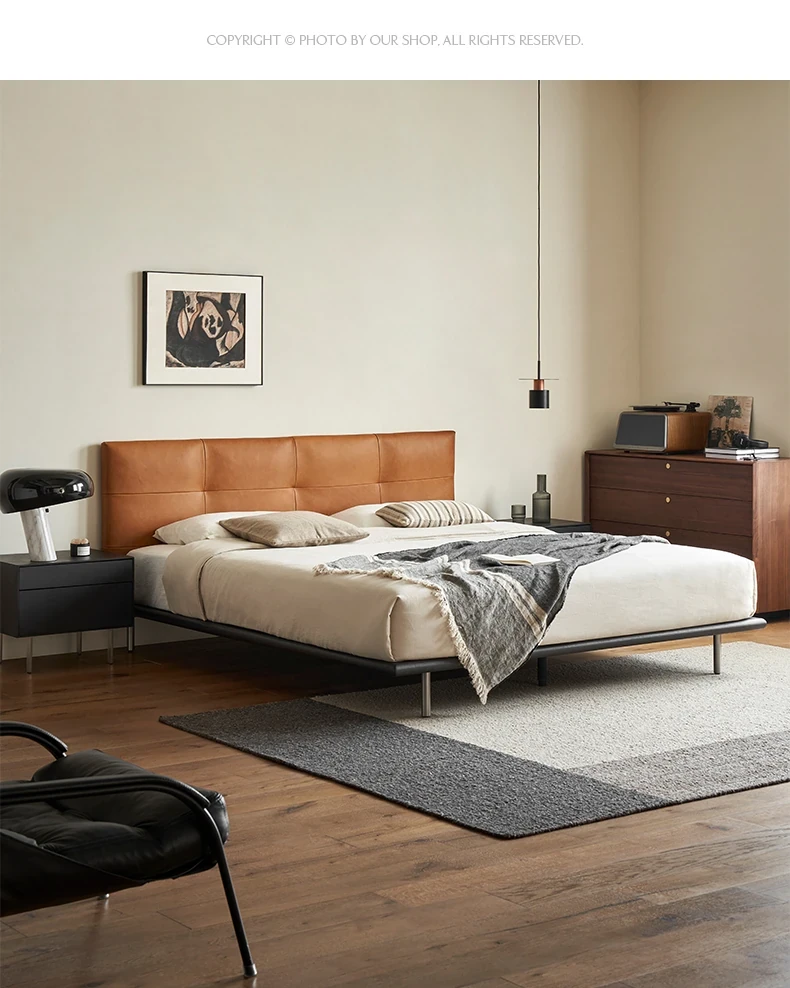 [Brown black frame-camel bedside] leather bed + ivory black bedside table 2