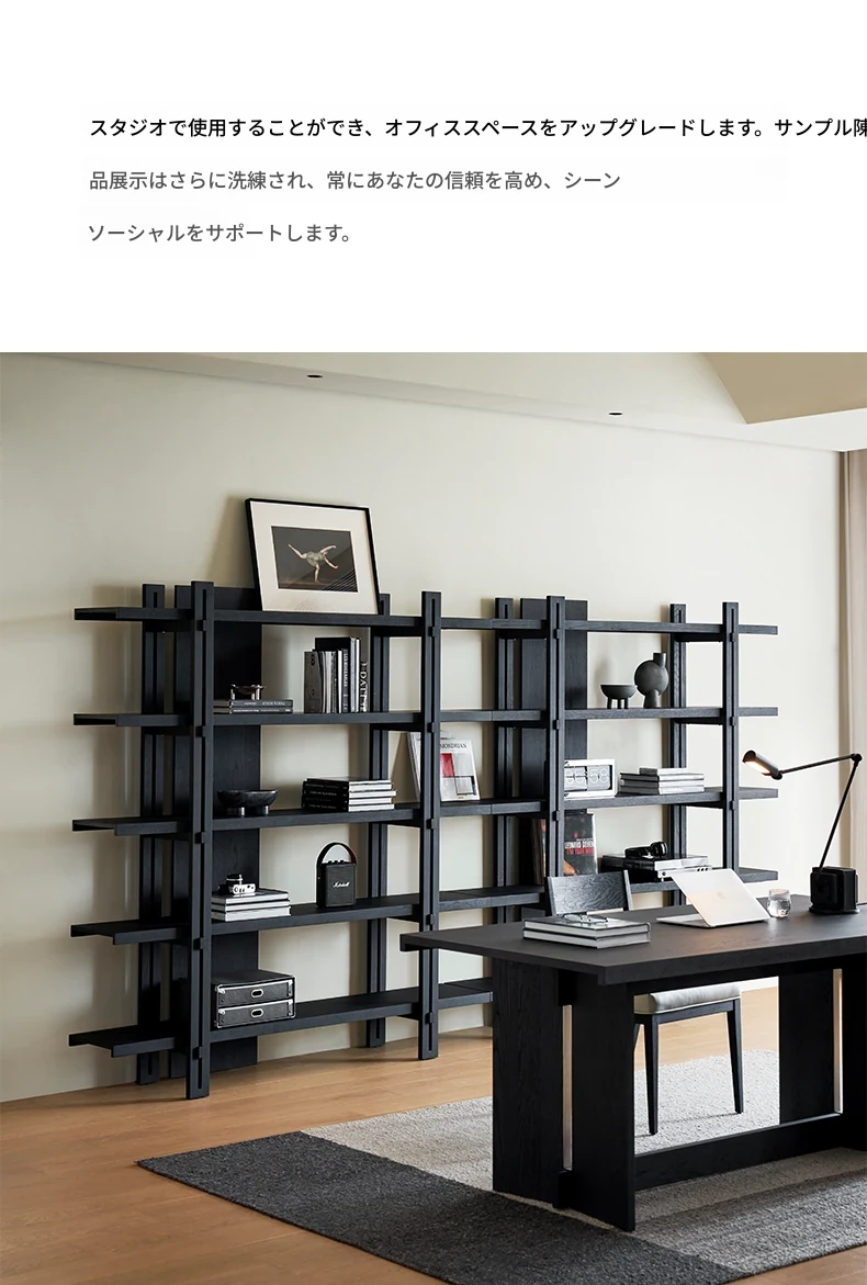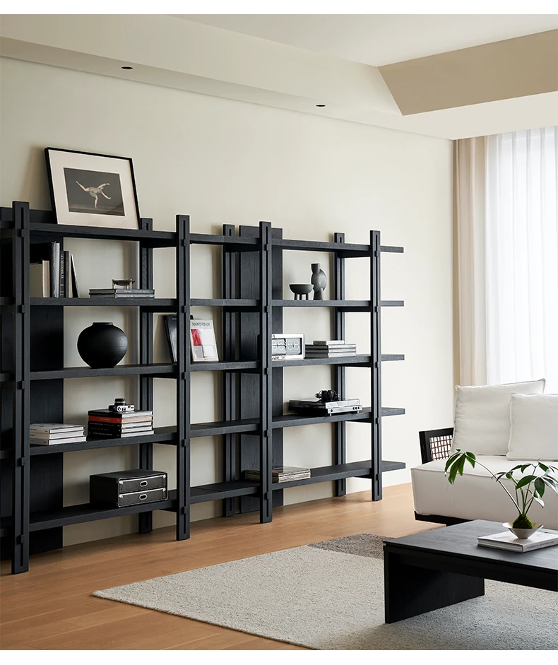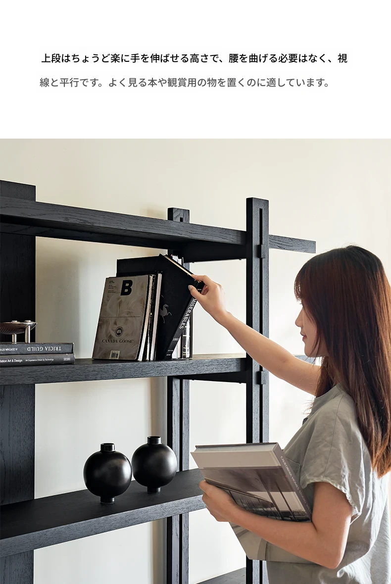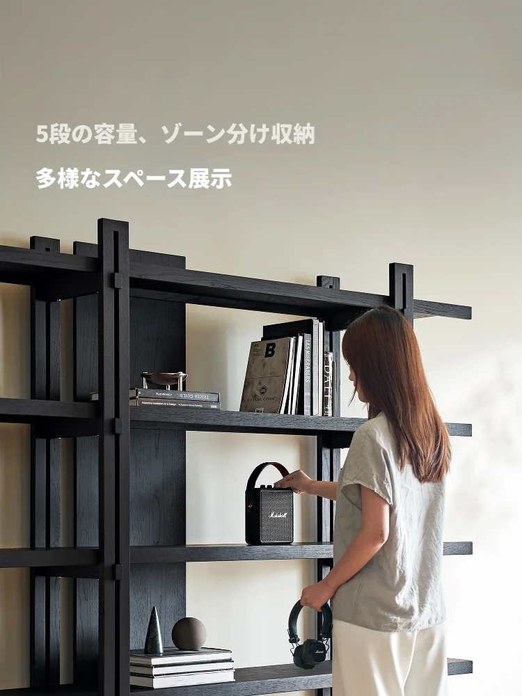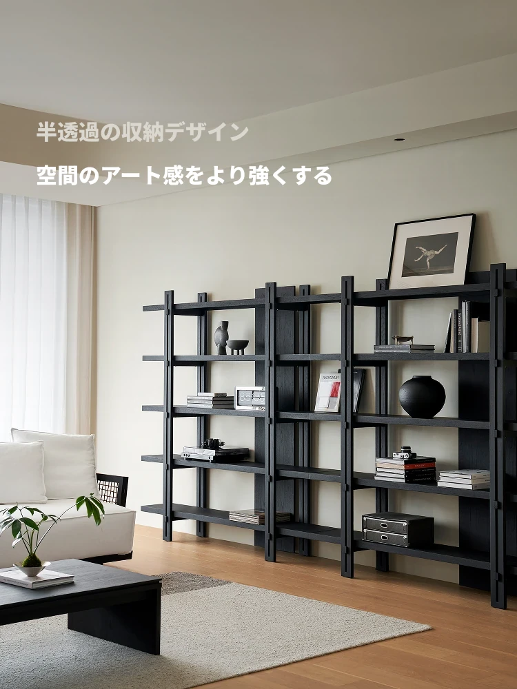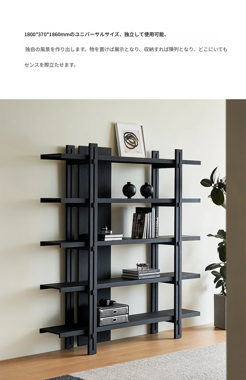 Kena可纳/千叶書架 - モダンな和の美を感じる黒い実木製のフロアシェルフ、リビングにぴったりの侘寂風ディスプレイラック。おしゃれで機能的な収納スペースを実現!