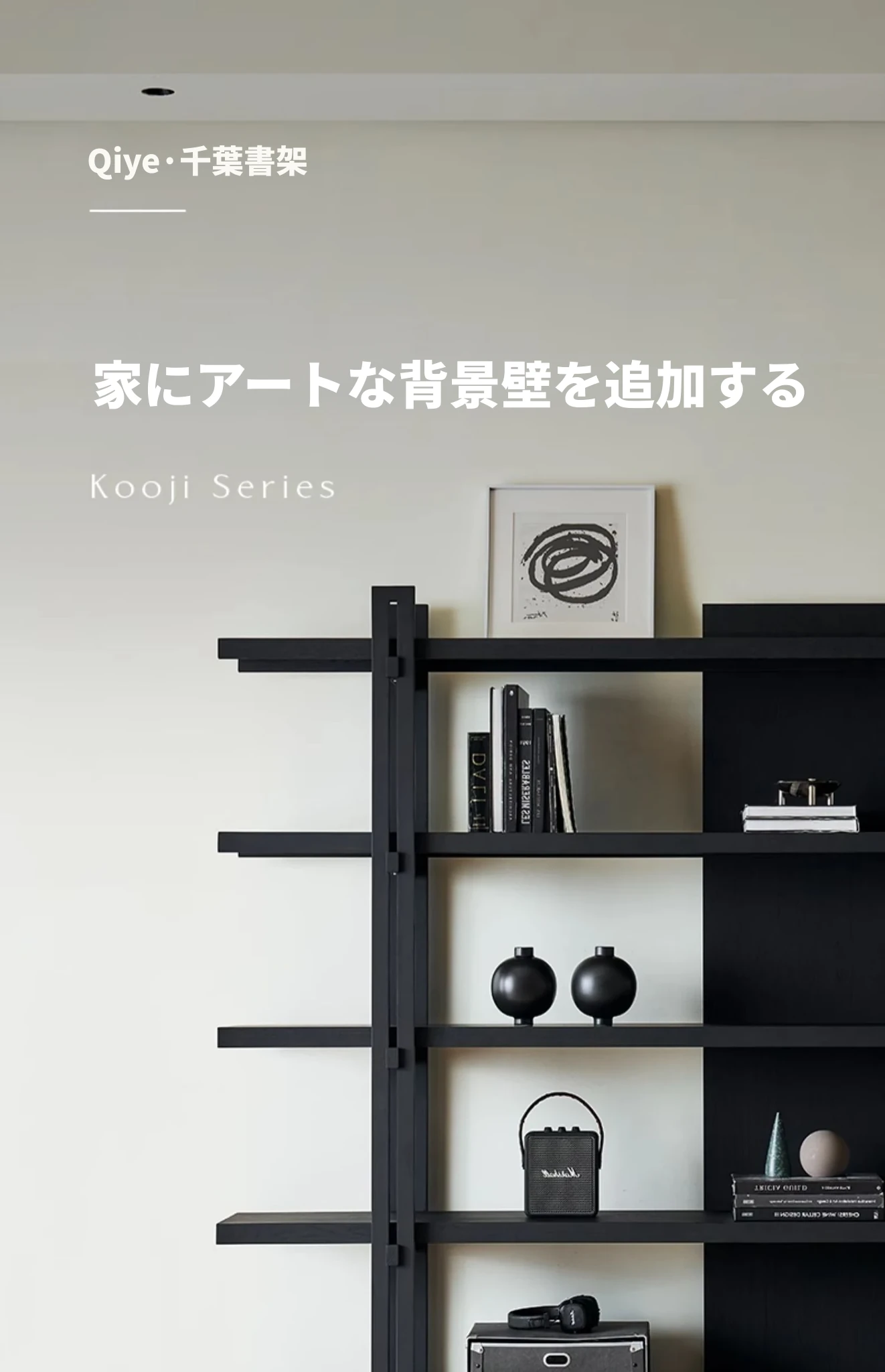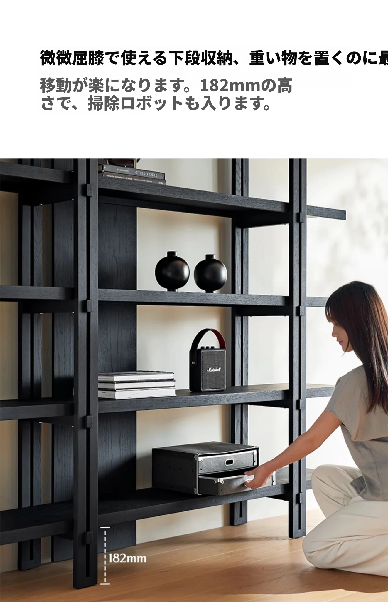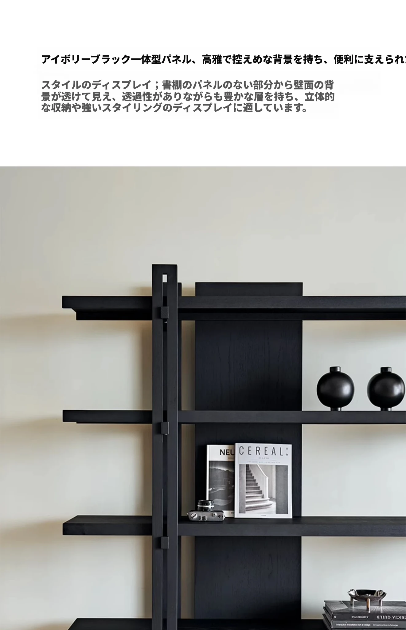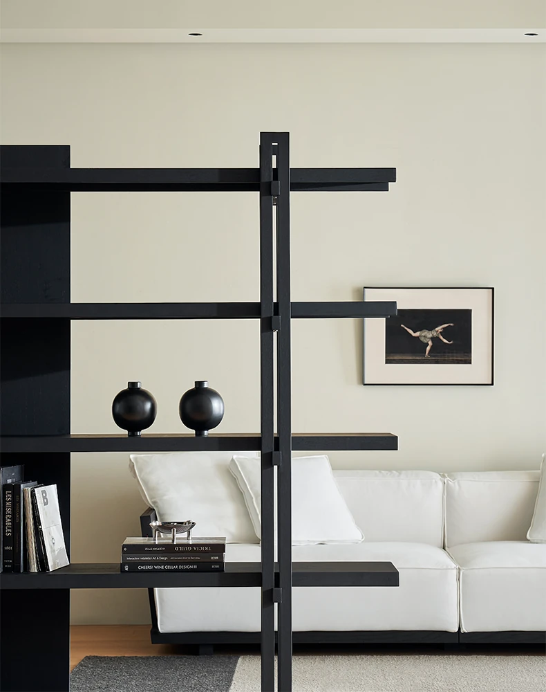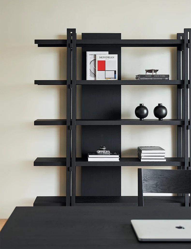 Kena可纳/千叶書架 - モダンな和の美を感じる黒い実木製のフロアシェルフ、リビングにぴったりの侘寂風ディスプレイラック。おしゃれで機能的な収納スペースを実現!