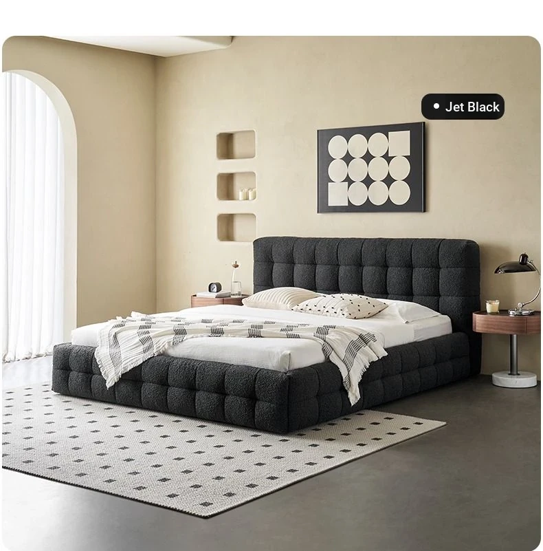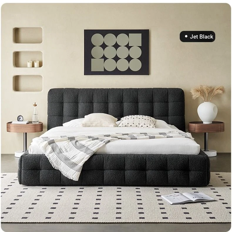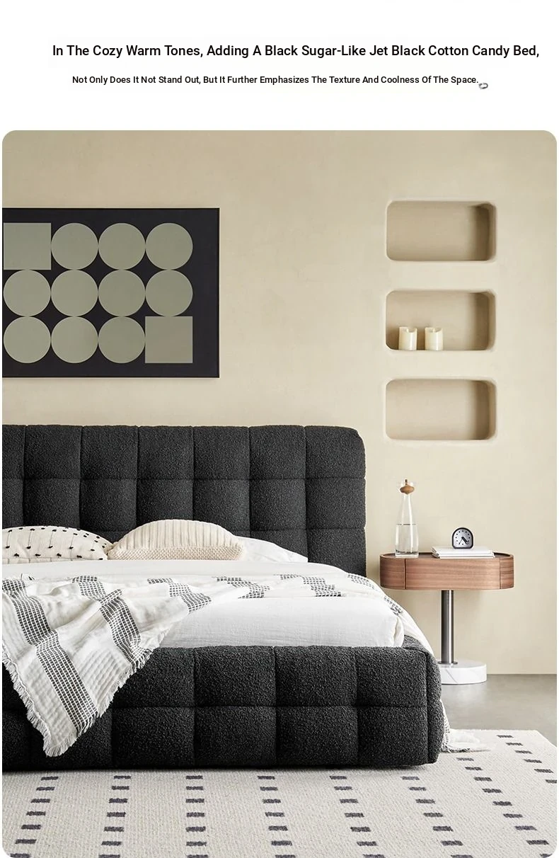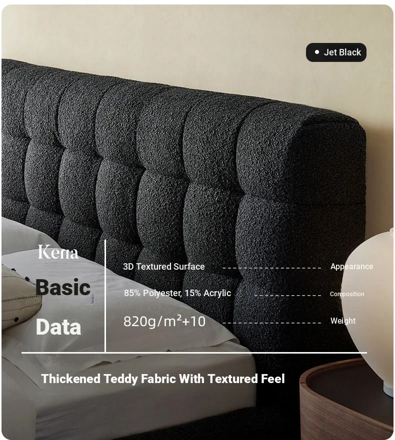 Kena Cotton Candy Fabric Bed - French Vintage Black Double Bed with Creamy Lamb Fleece for Master Bedroom - Perfect Blend of Elegance and Comfort