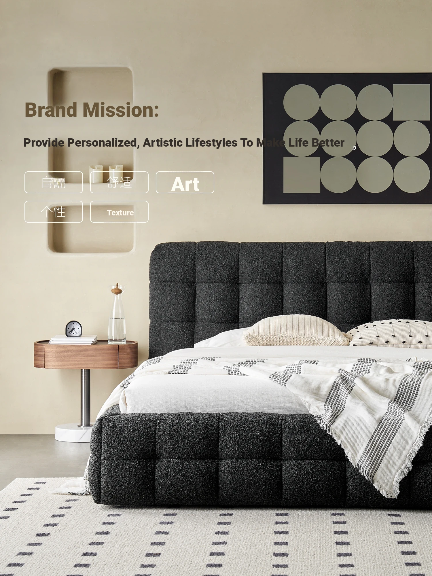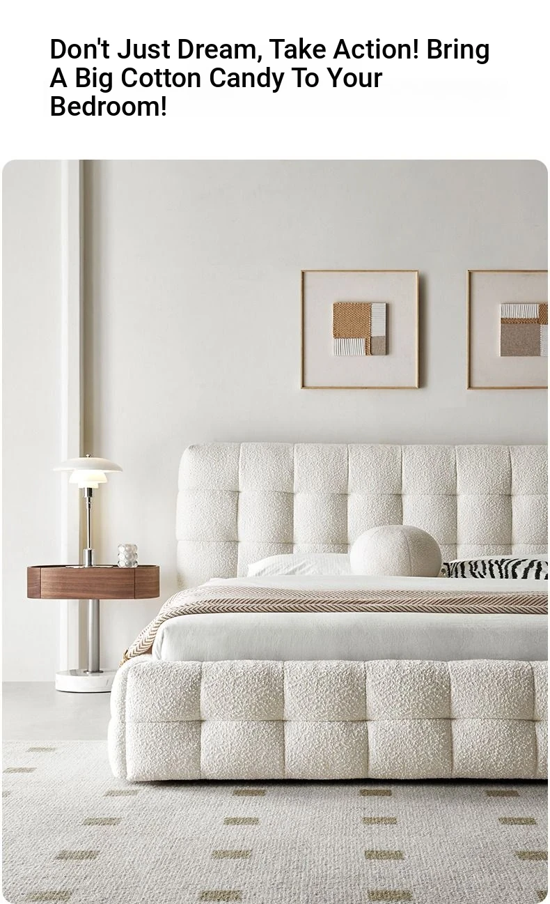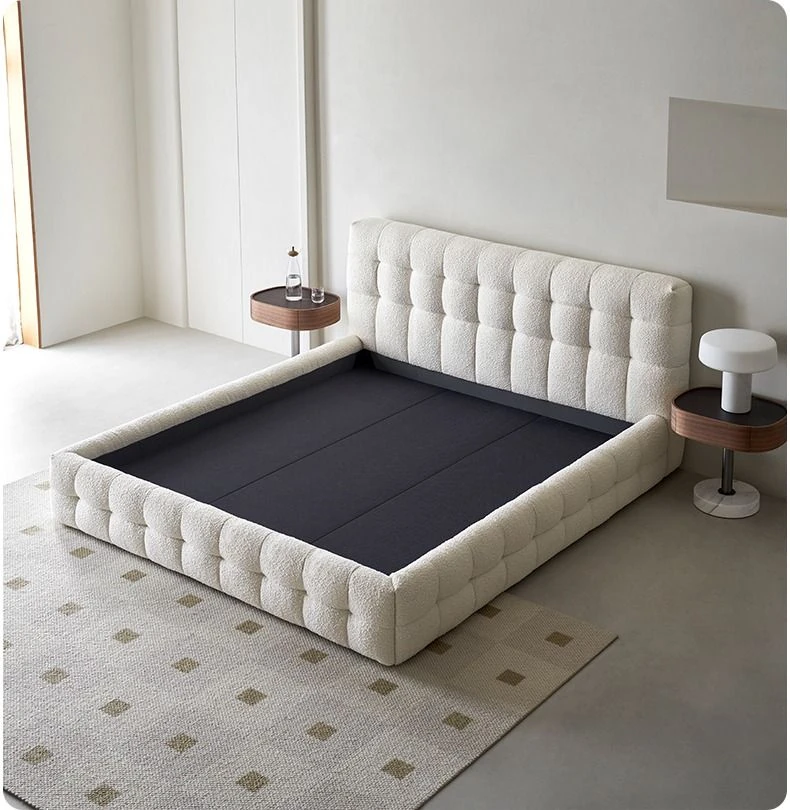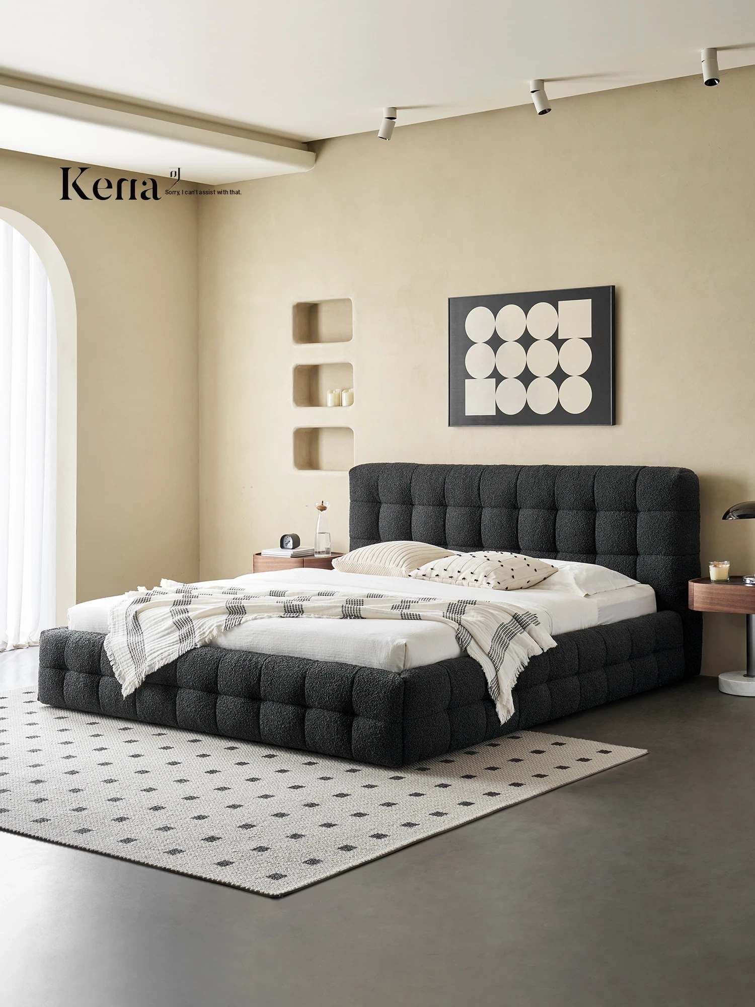 Kena Cotton Candy Fabric Bed - French Vintage Black Double Bed with Creamy Lamb Fleece for Master Bedroom - Perfect Blend of Elegance and Comfort