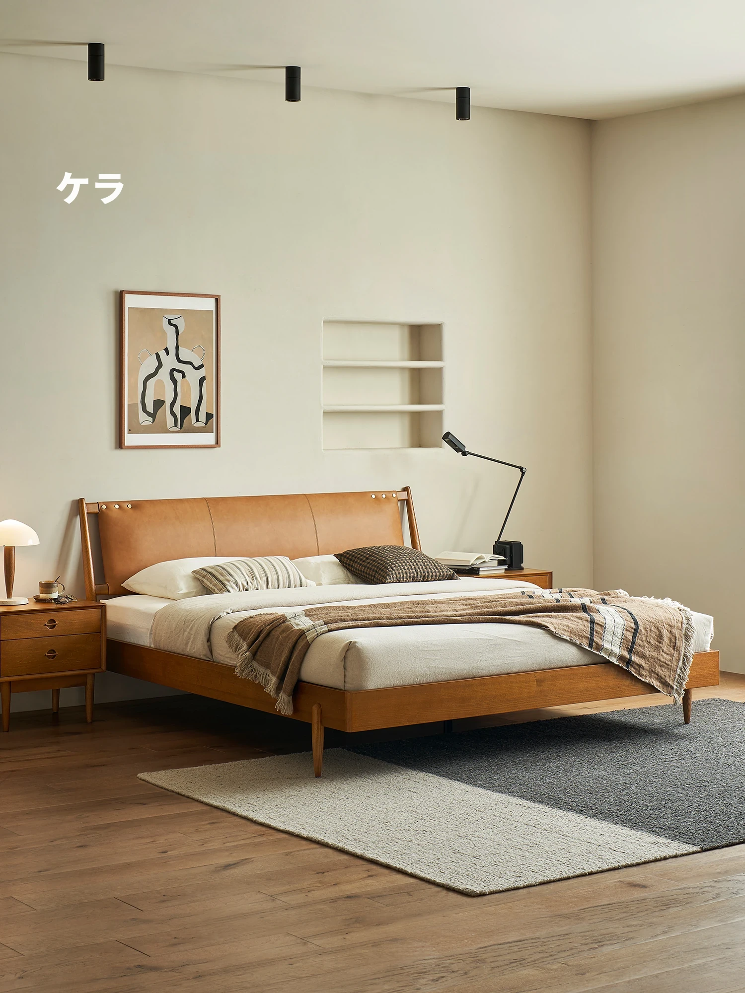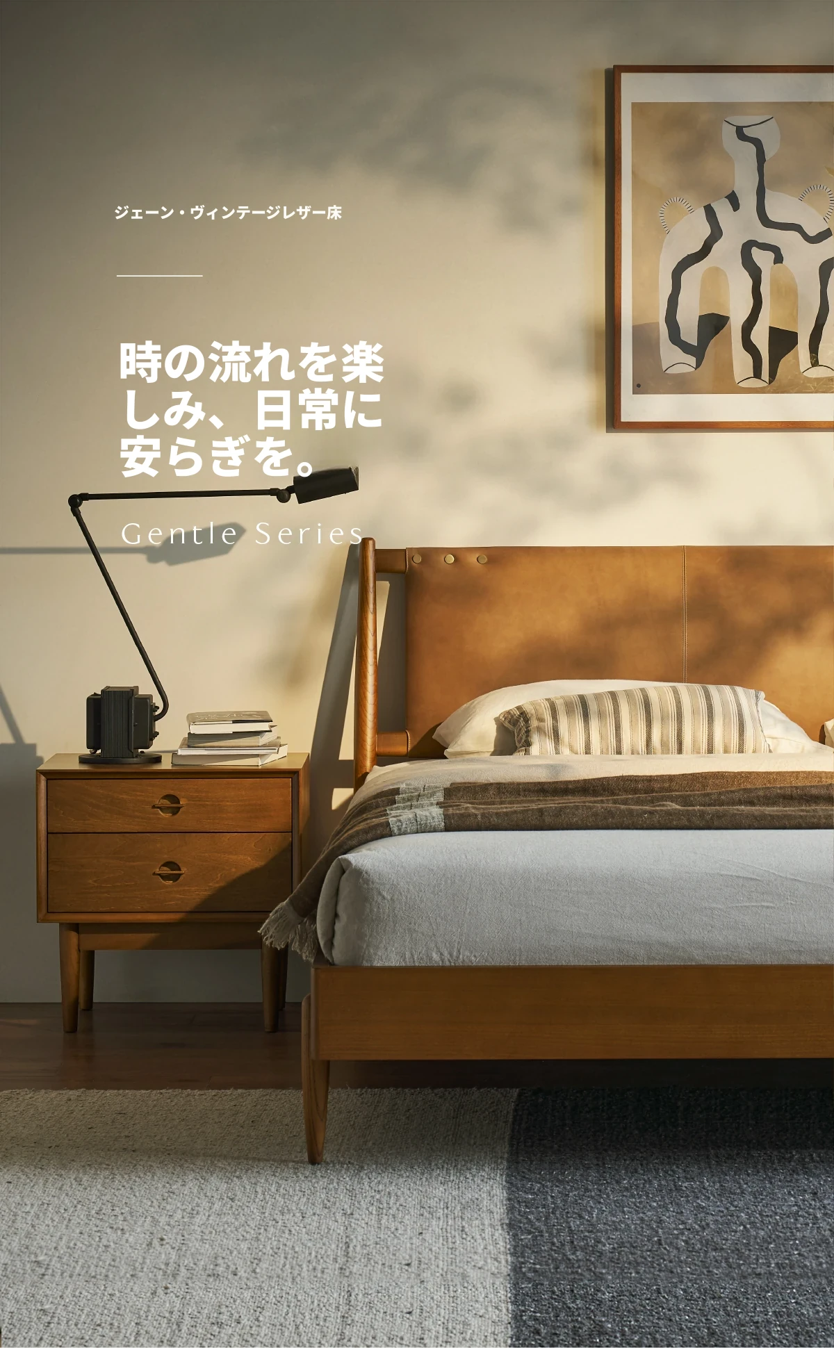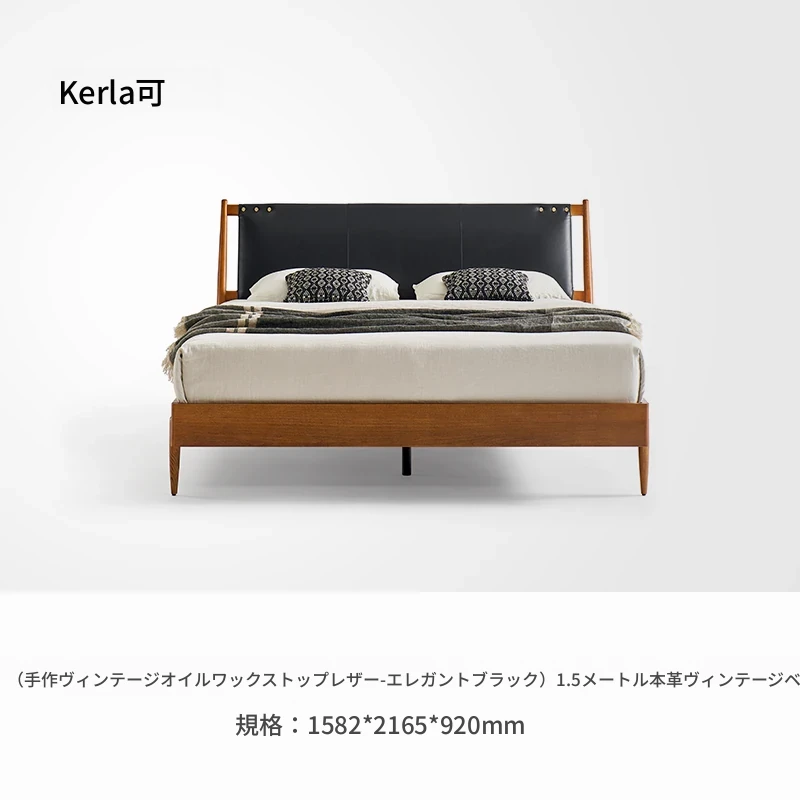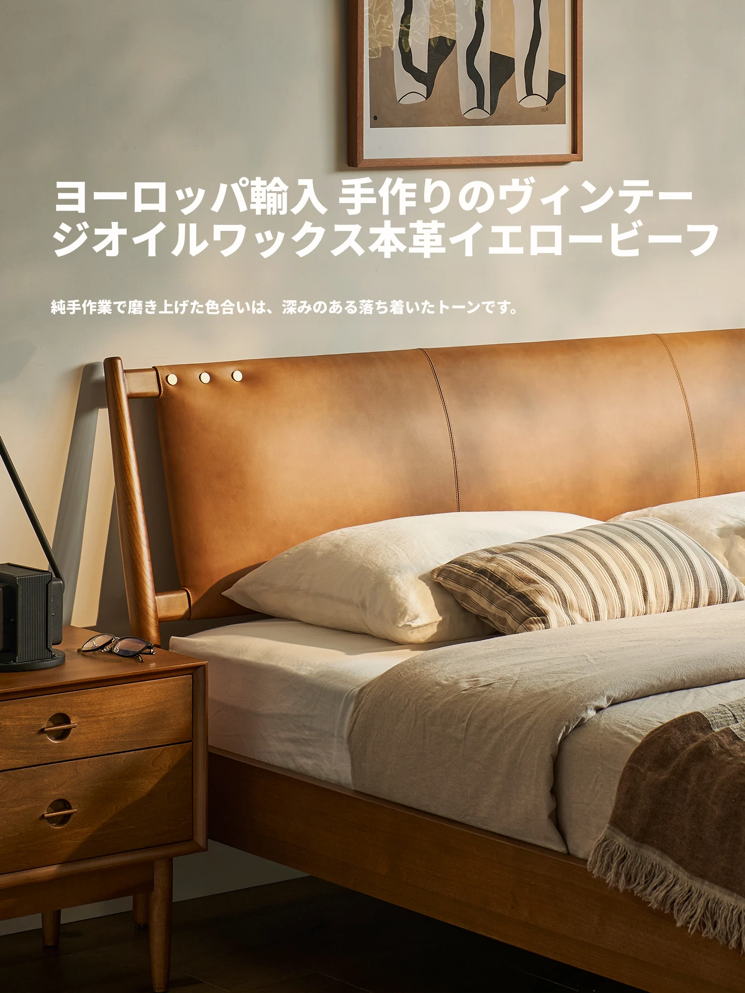 Kena可纳 北欧スタイルの高級本革ベッド - モダンでシンプルなデザイン、上質な牛革使用のヴィンテージダブルベッド。実木フレームで耐久性抜群!あなたの寝室に洗練された魅力をプラス。