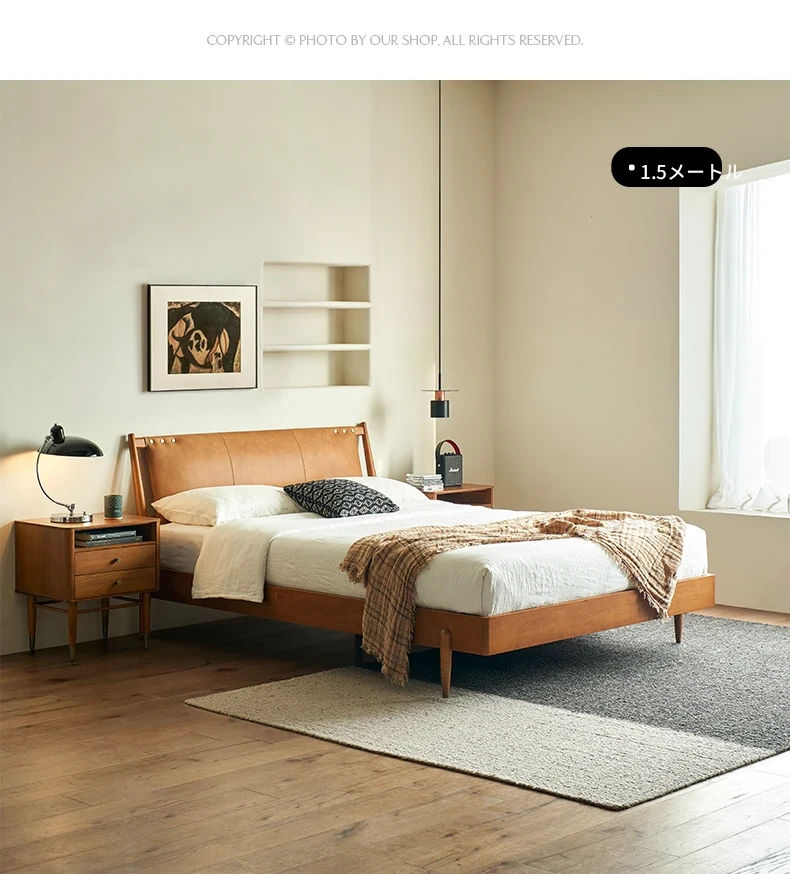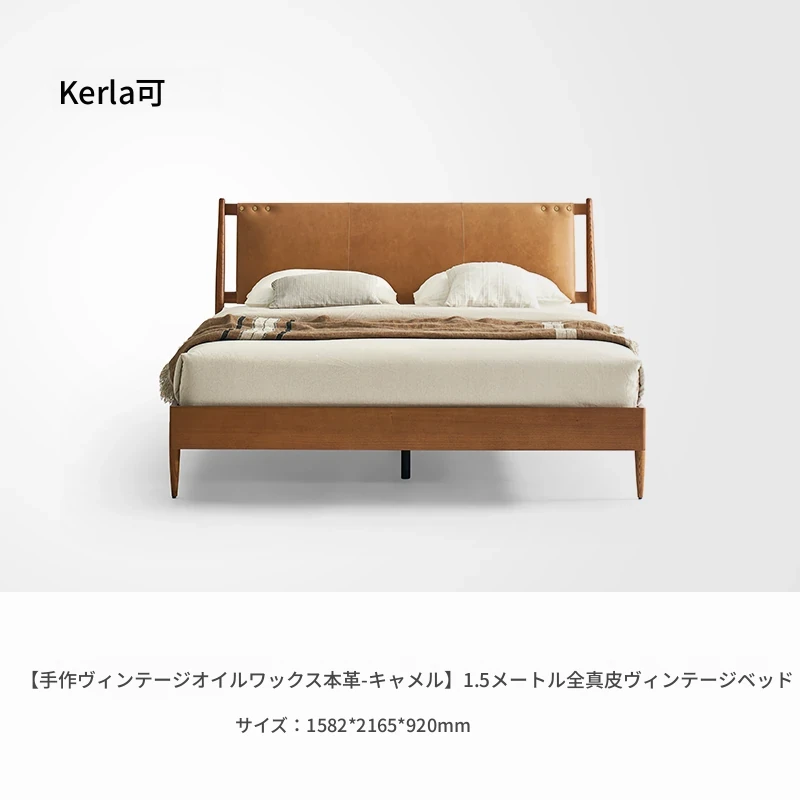 【レトロオイルワックスレザー-キャメル】1.5メートル全真皮レトロベッド 在庫あり