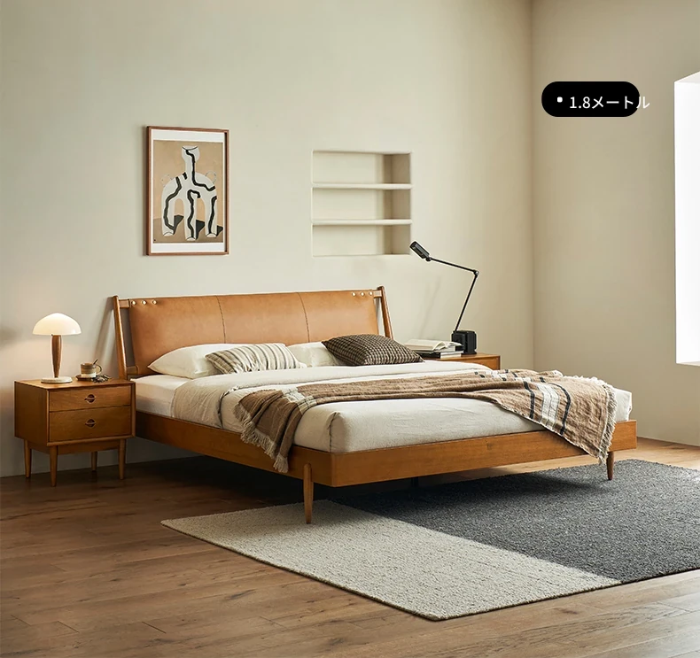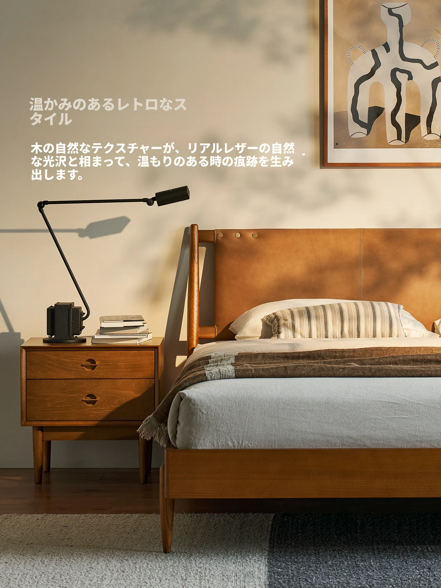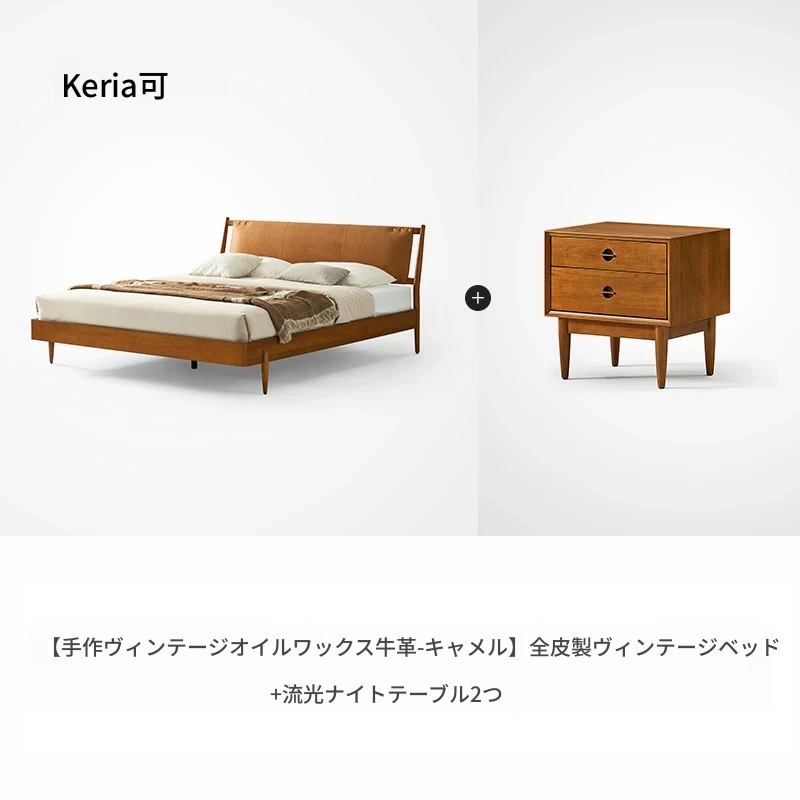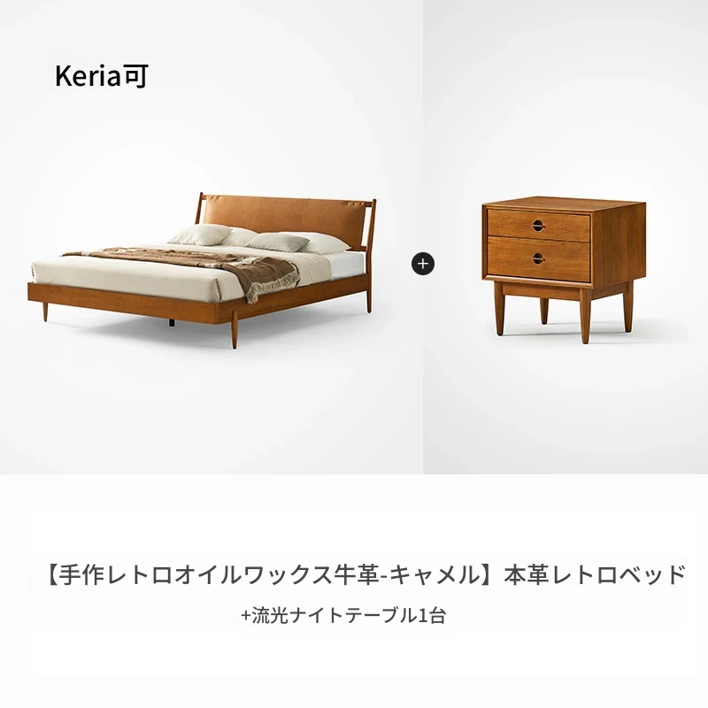 【レトロオイルワックスレザー-キャメル】全真皮レトロベッド+流光ナイトテーブル1個