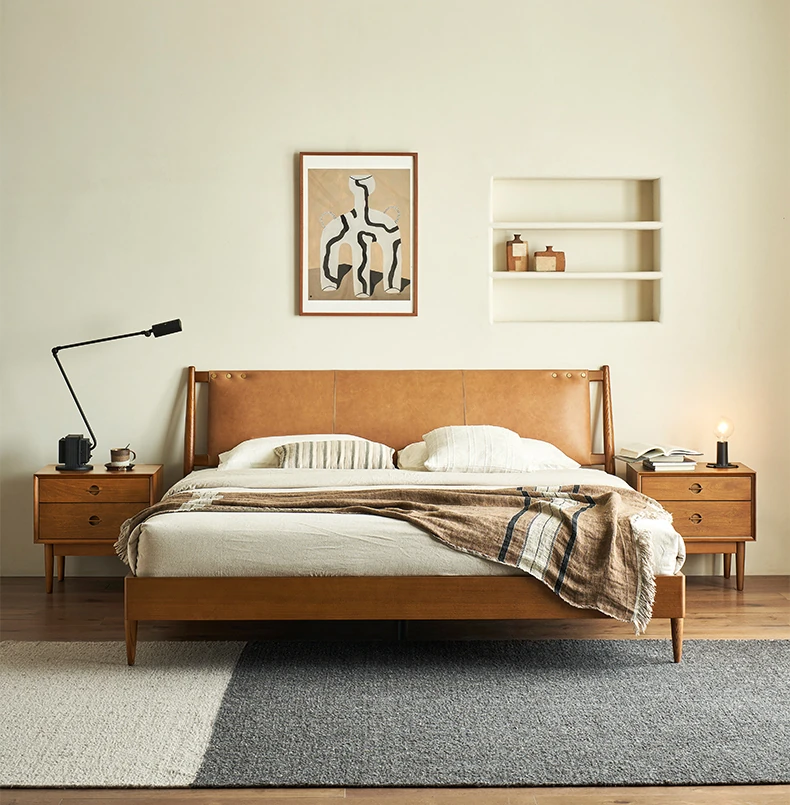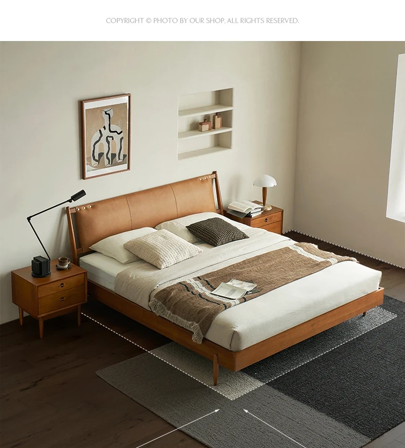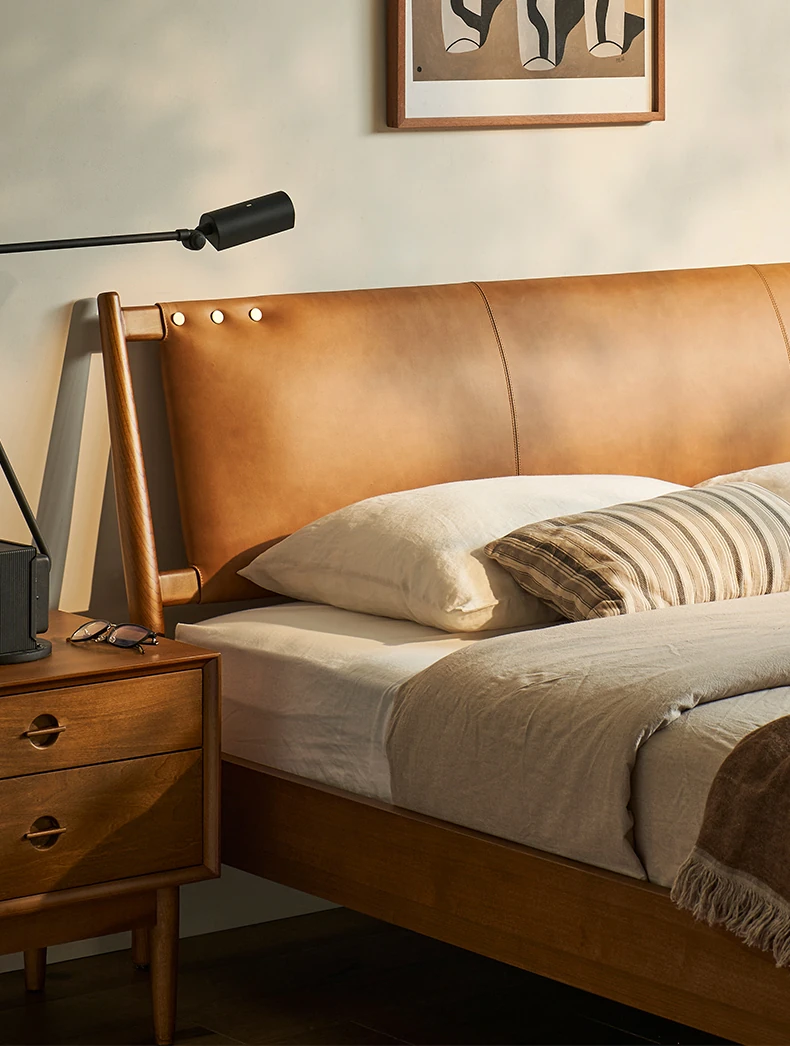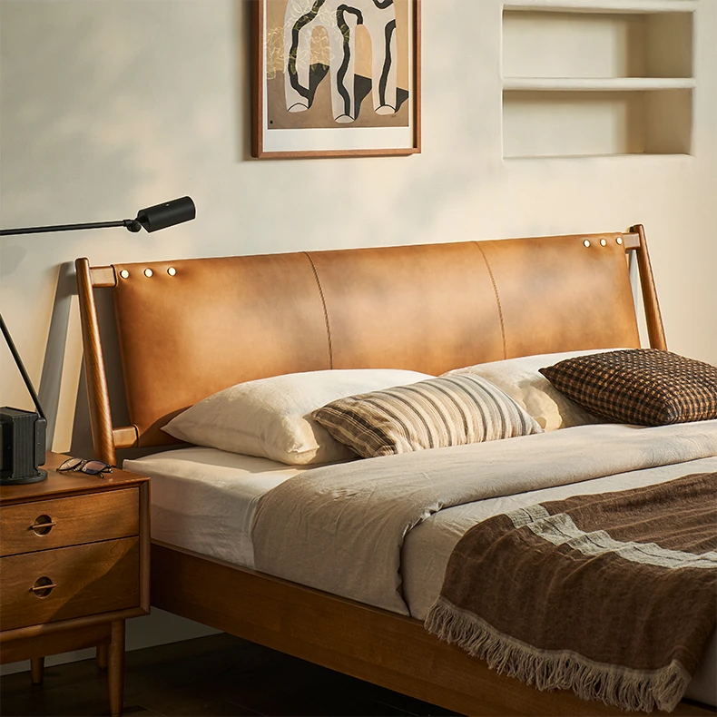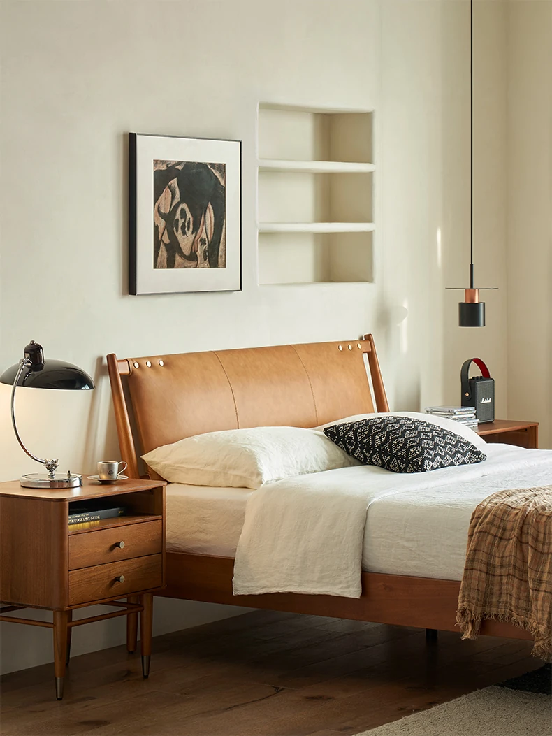 【レトロオイルワックスレザー-キャメル】全真皮レトロベッド+流光ナイトテーブル1個