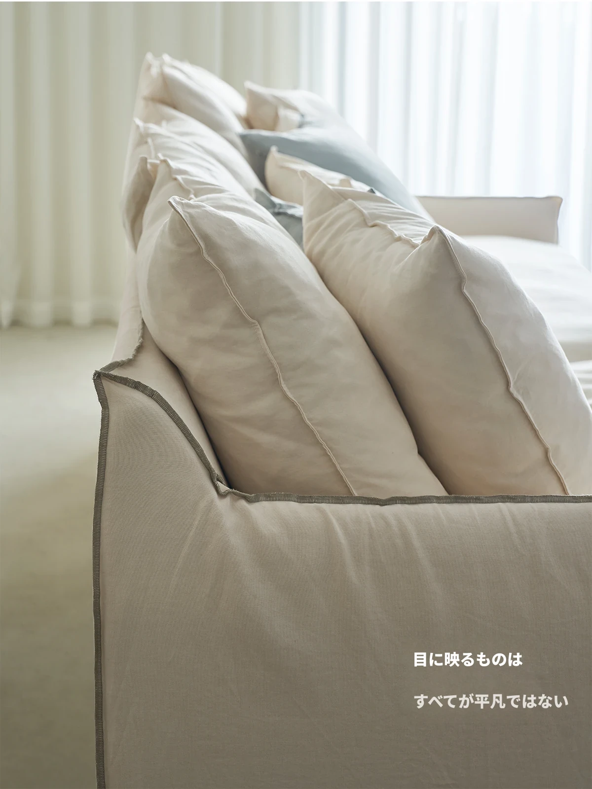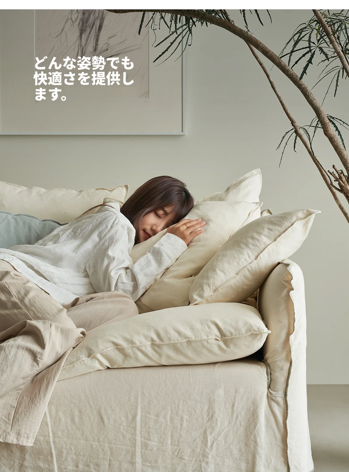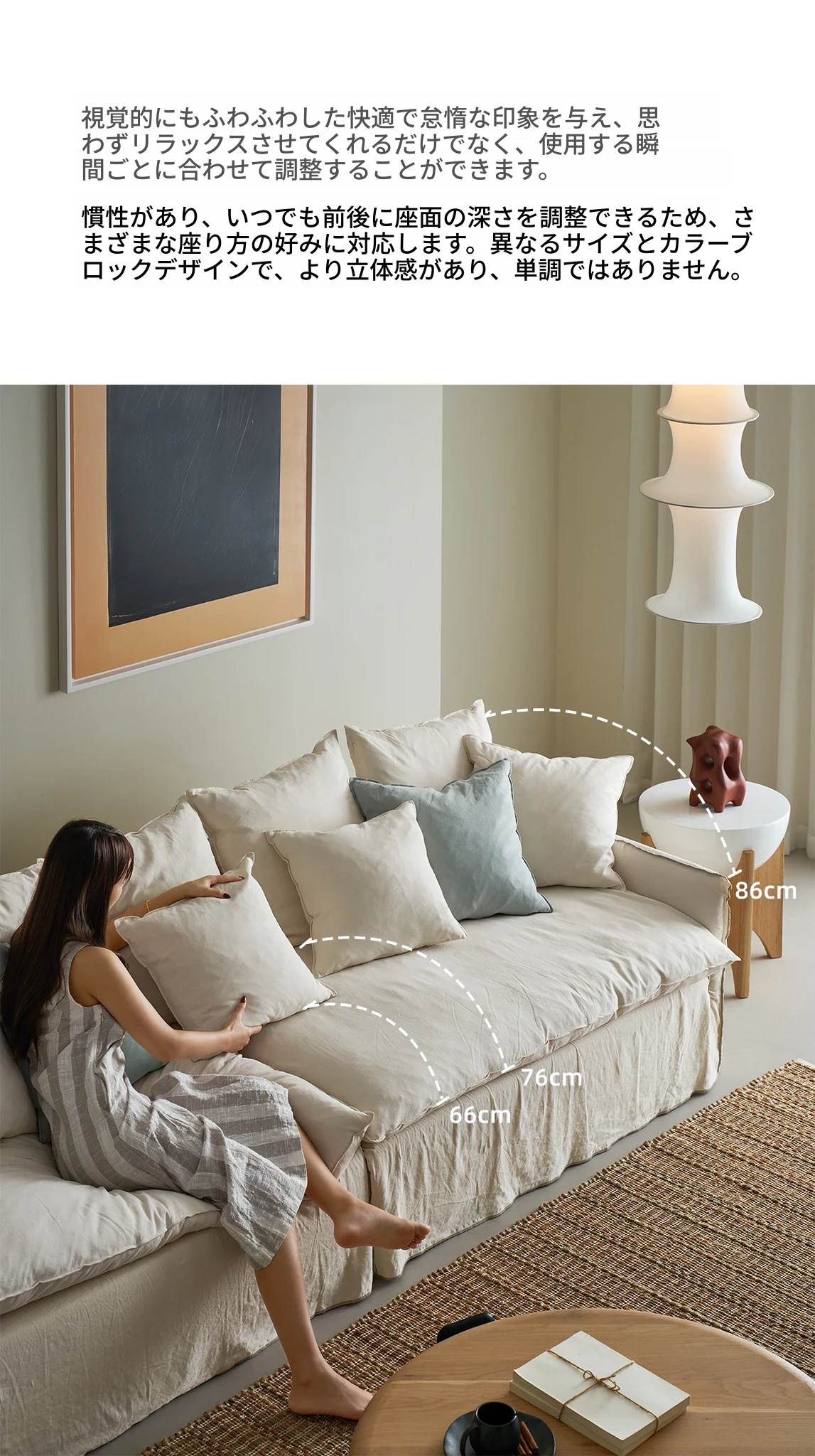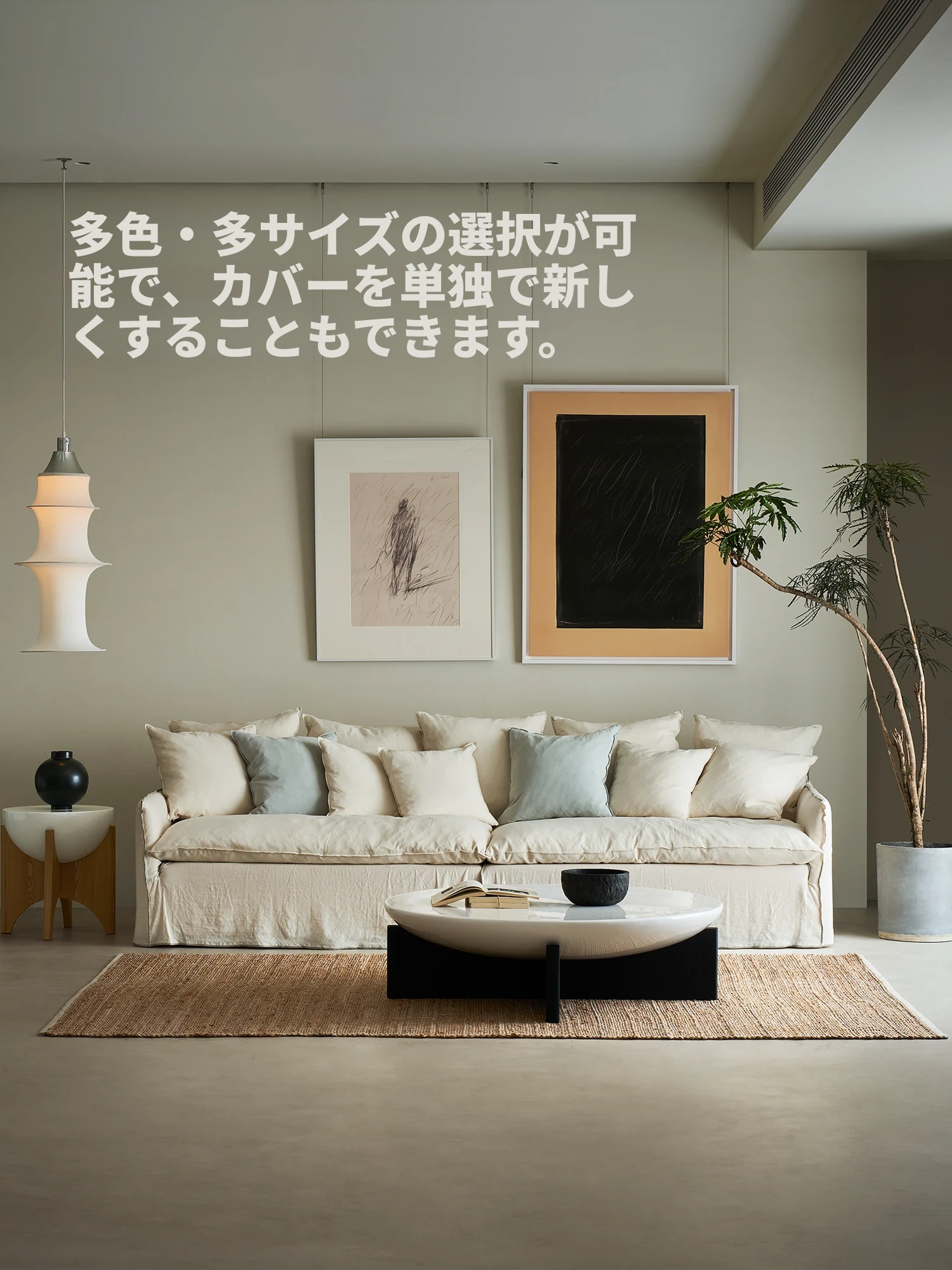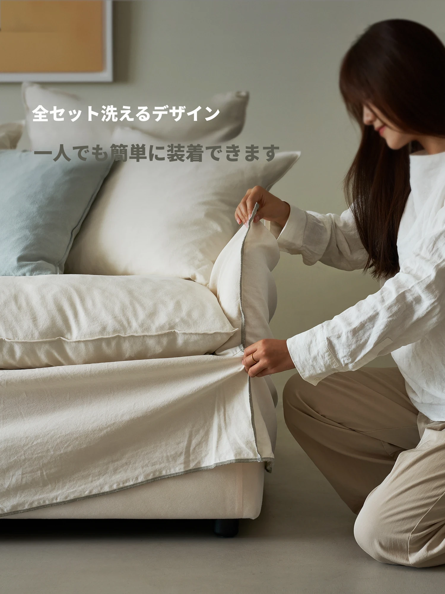 Kena可纳/肆野布艺ソファー 羽毛を使用した侘寂スタイル コンパクトな小型住居に最適 洗濯可能なナチュラルリネン素材 三人掛けZ型デザインでおしゃれな空間を演出!