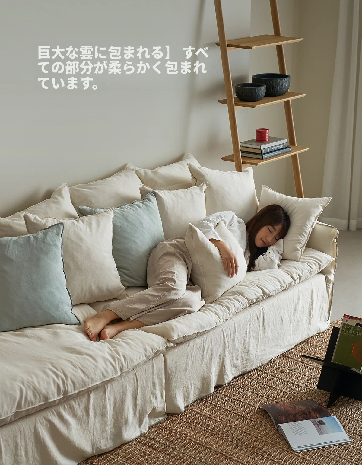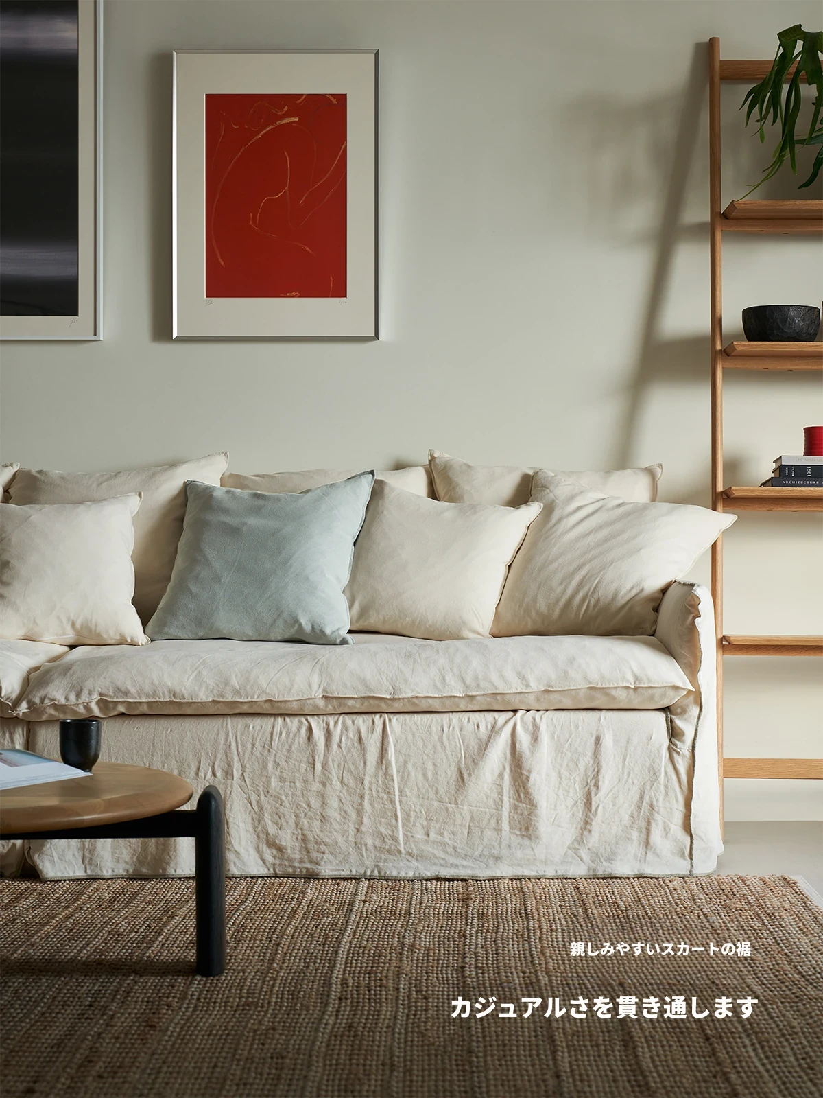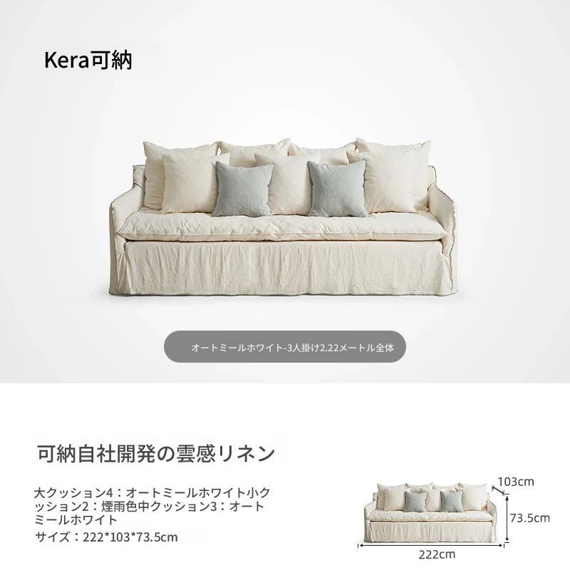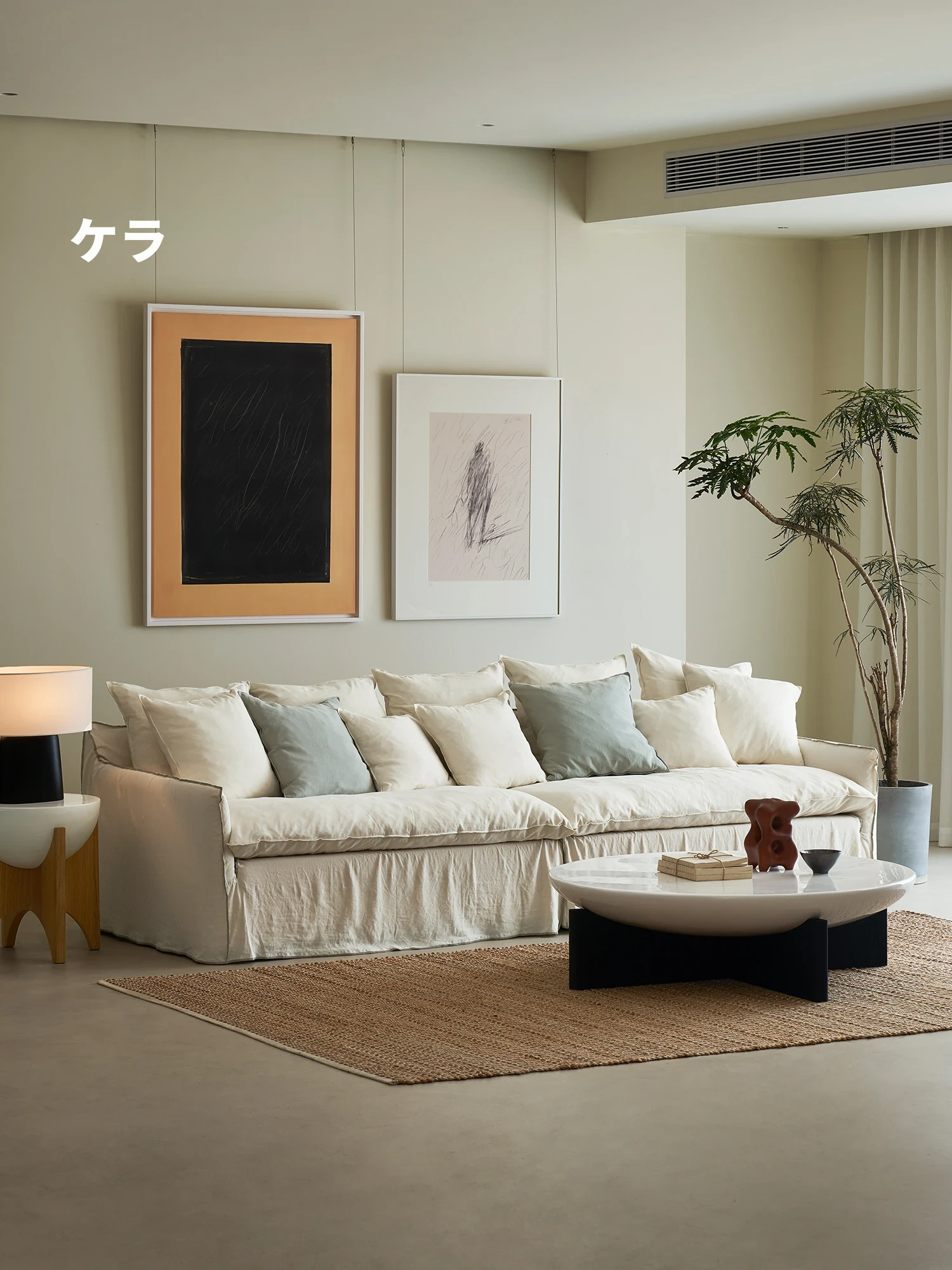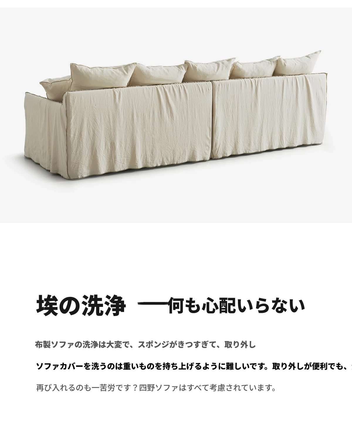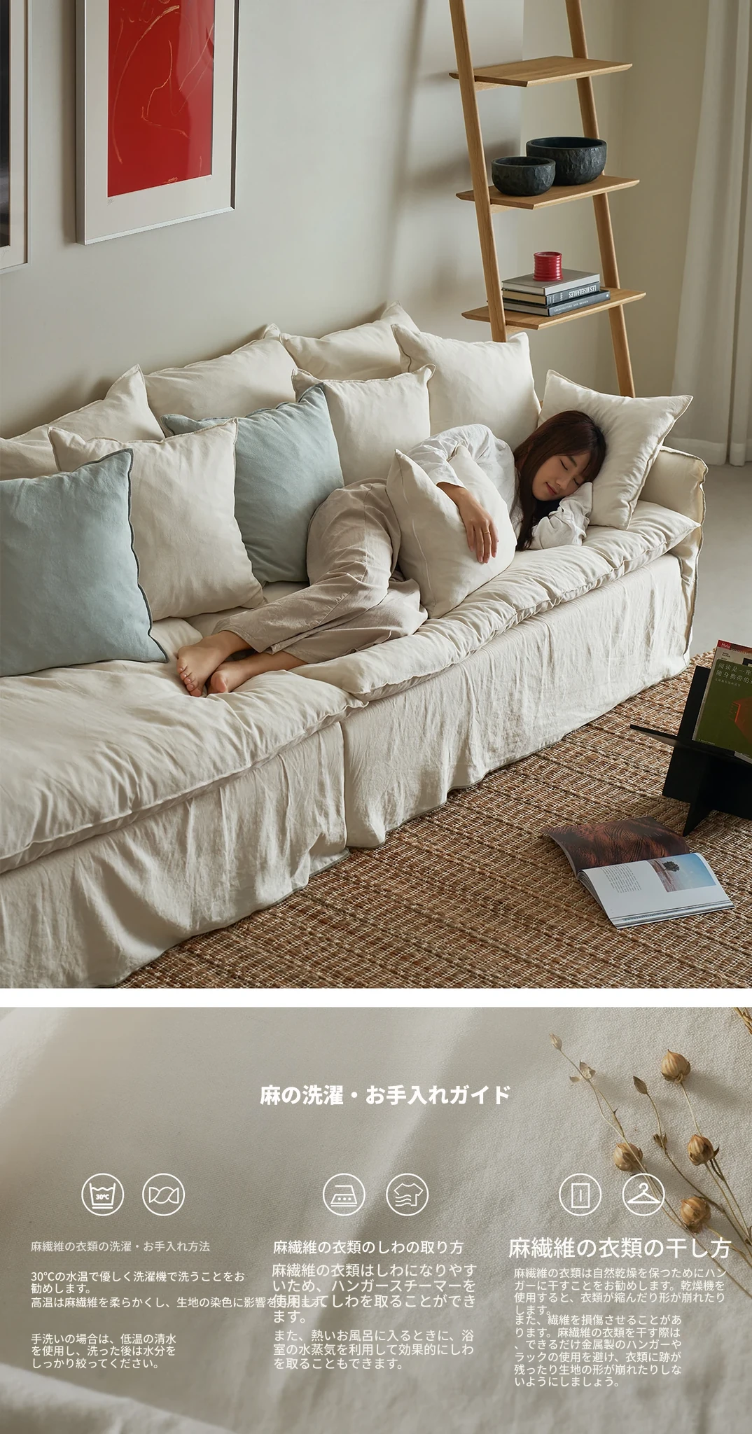 Kena可纳/肆野布艺ソファー 羽毛を使用した侘寂スタイル コンパクトな小型住居に最適 洗濯可能なナチュラルリネン素材 三人掛けZ型デザインでおしゃれな空間を演出!