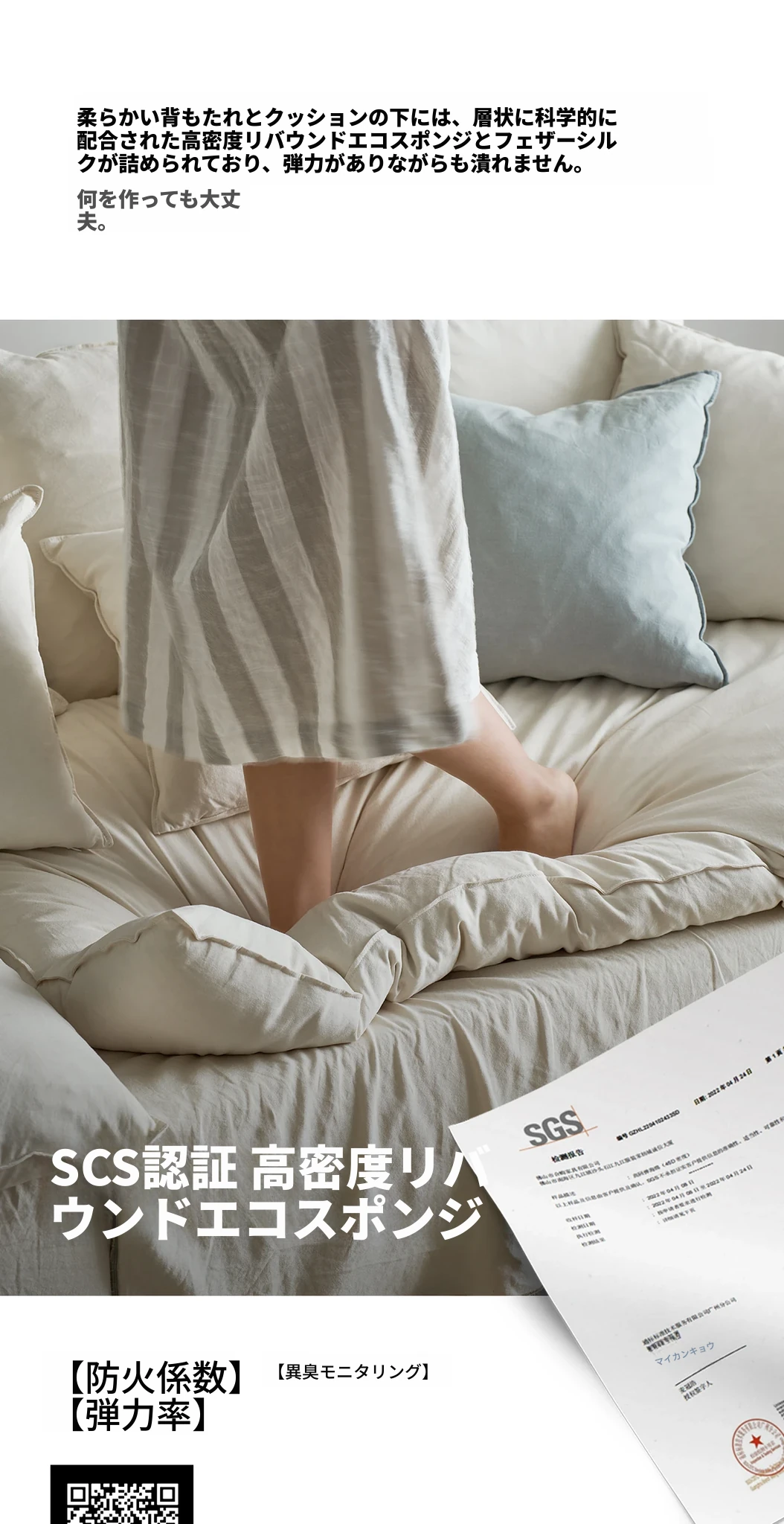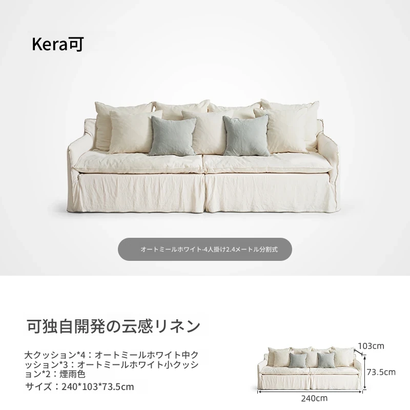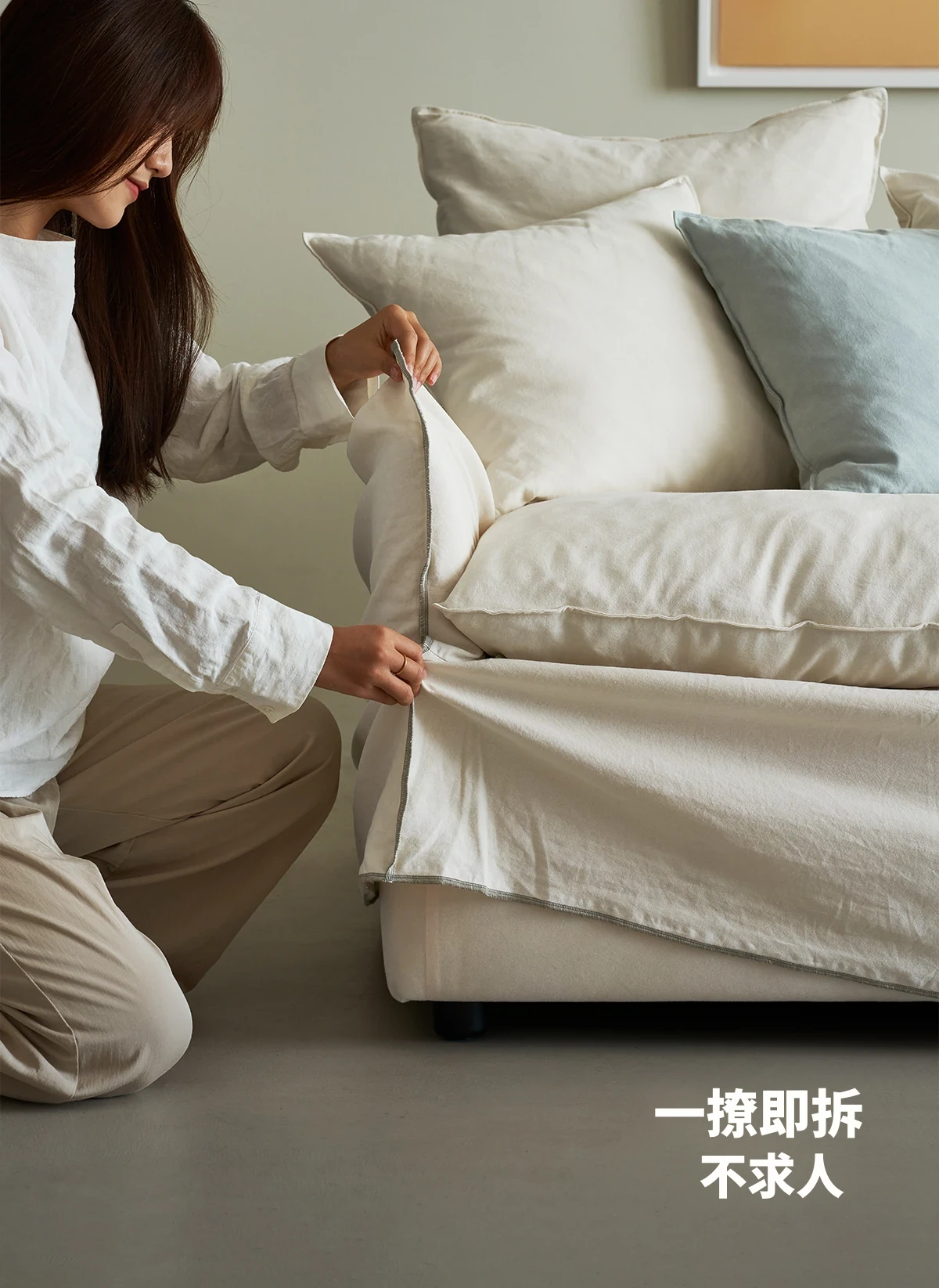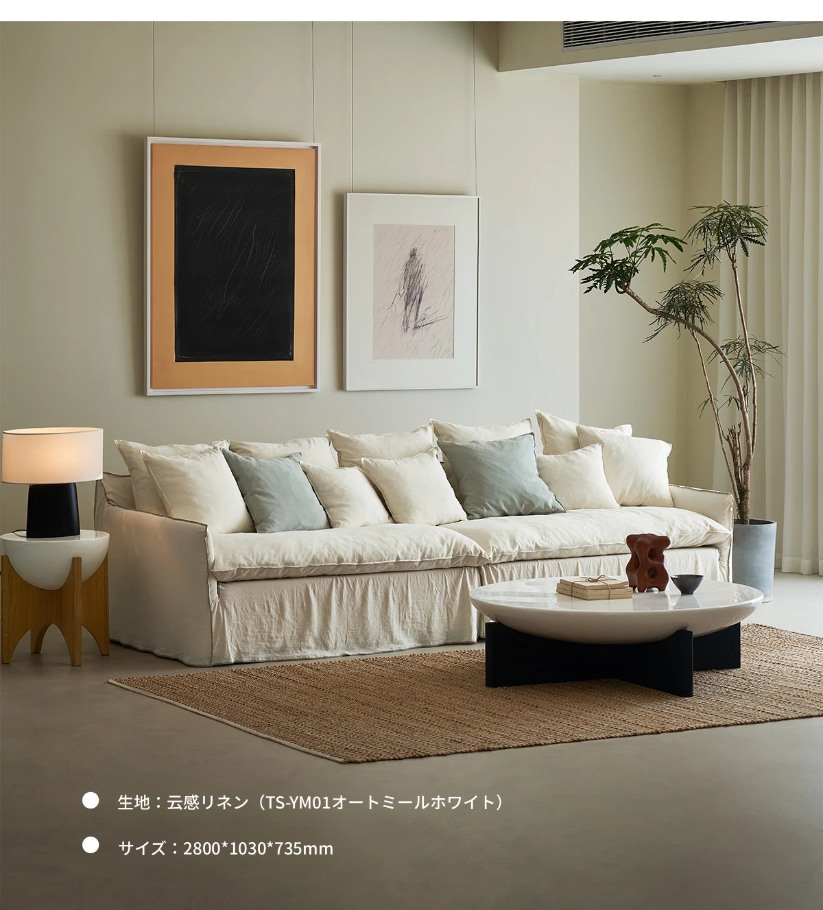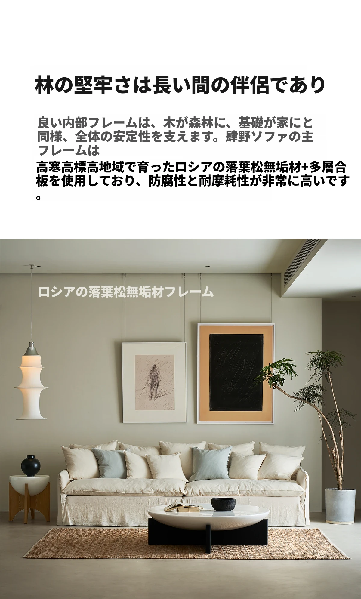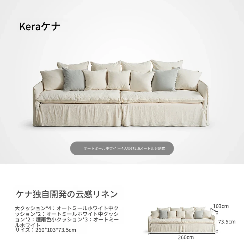 Kena可纳/肆野布艺ソファー 羽毛を使用した侘寂スタイル コンパクトな小型住居に最適 洗濯可能なナチュラルリネン素材 三人掛けZ型デザインでおしゃれな空間を演出!
