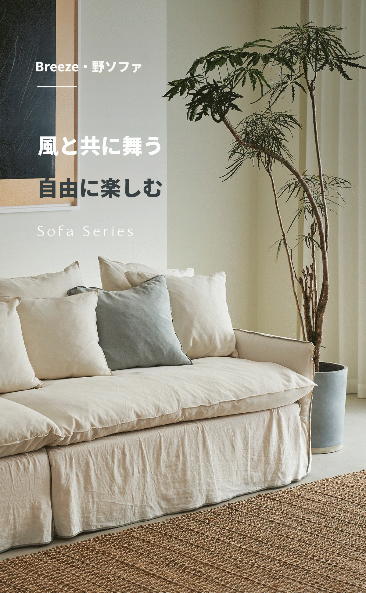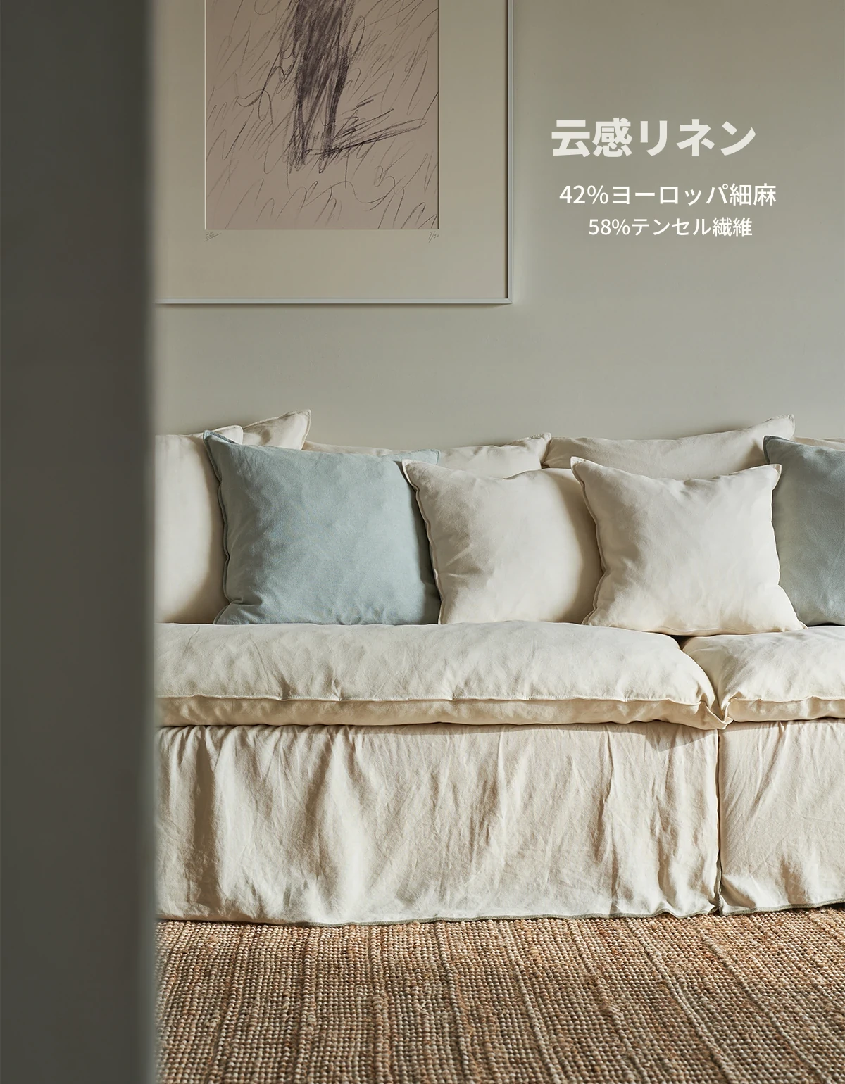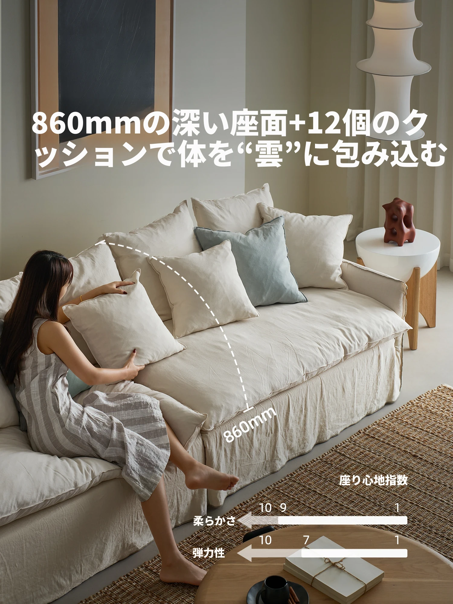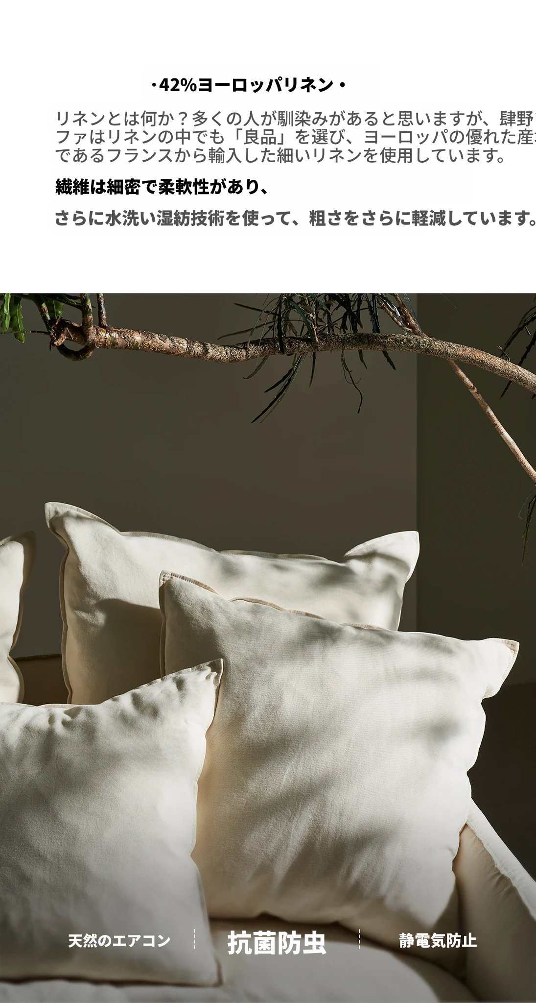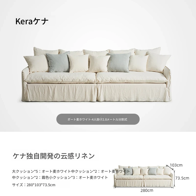 Kena可纳/肆野布艺ソファー 羽毛を使用した侘寂スタイル コンパクトな小型住居に最適 洗濯可能なナチュラルリネン素材 三人掛けZ型デザインでおしゃれな空間を演出!